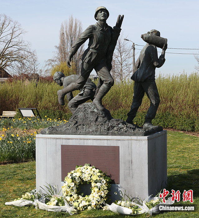 圖為在波普林格一戰(zhàn)華工紀(jì)念園,一戰(zhàn)華工紀(jì)念雕像前擺放著花環(huán)花束。 中新社記者 德永健 攝