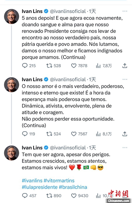 巴西音樂家伊萬·林斯在社交媒體連發(fā)多條留言,引發(fā)網(wǎng)絡熱潮。截圖