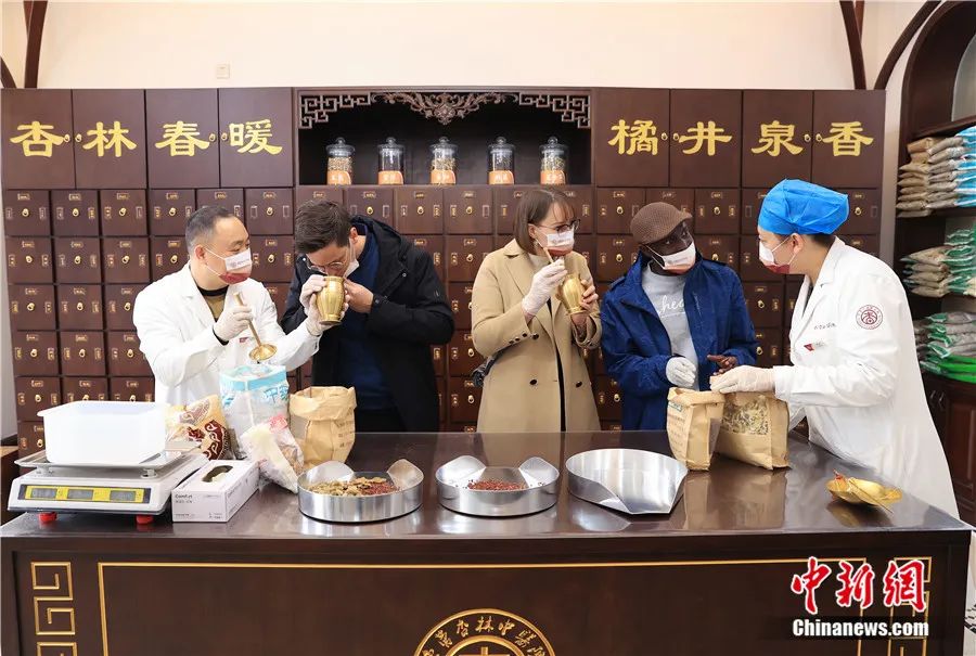 來(lái)自比利時(shí)、白俄羅斯和加納的外國(guó)友人在山東東營(yíng)一家中醫(yī)醫(yī)院的中藥房識(shí)別、稱量中藥材。周廣學(xué) 攝