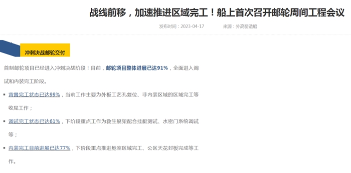 外高橋造船公布首艘國產(chǎn)大郵輪最新進展情況。外高橋造船網(wǎng)站截圖