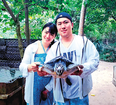 2018年,許振軒與李丹宜正在江蘇南京讀大學(xué)。一次偶然的機(jī)會(huì),兩人到斯里蘭卡體驗(yàn)了一場(chǎng)特殊的“海龜保育義工之旅”。許振軒一直非常喜歡去海洋館,宿舍還有好幾個(gè)烏龜?shù)?。“看著它們從孵化到慢慢成長(zhǎng),感覺(jué)非常奇妙。剛好一直關(guān)注的公眾號(hào)提供了研學(xué)機(jī)會(huì),我從眾多項(xiàng)目里選擇了‘海龜保育’。”許振軒的決定也影響了喜愛(ài)小動(dòng)物的女朋友李丹宜。