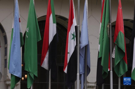 這是5月7日在位于埃及開(kāi)羅的阿拉伯國(guó)家聯(lián)盟總部拍攝的敘利亞國(guó)旗(左四)。新華社發(fā)(艾哈邁德·戈馬 攝)