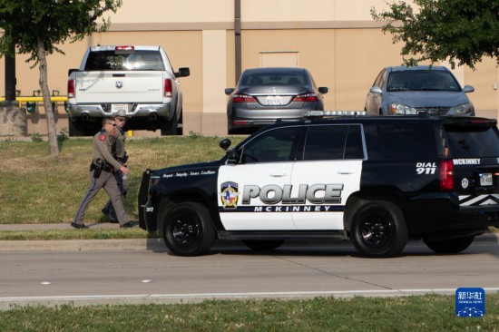 5月6日,警車停在美國得克薩斯州達(dá)拉斯近郊發(fā)生槍擊事件的購物中心附近。美國得克薩斯州達(dá)拉斯近郊一家購物中心6日發(fā)生槍擊事件。新華社發(fā)(田丹攝)