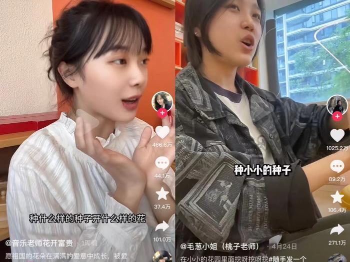 中新網(wǎng)查詢了她們在短視頻平臺上最早發(fā)布時間,桃子老師是在4月24日,黃老師是在4月28日。