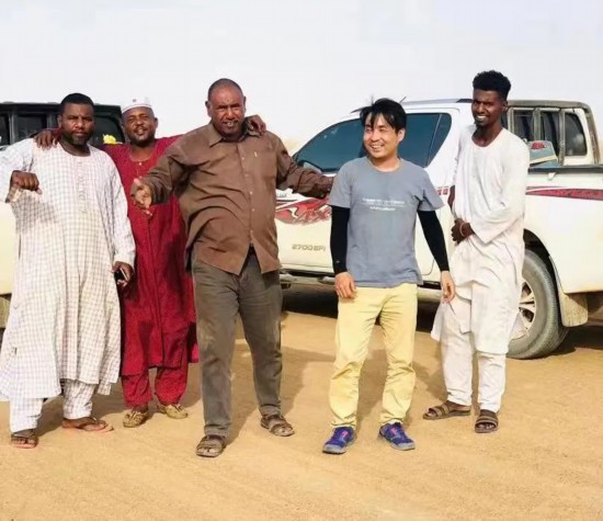 岳遠志(右二)在蘇丹與當?shù)嘏笥押嫌啊J茉L者供圖
