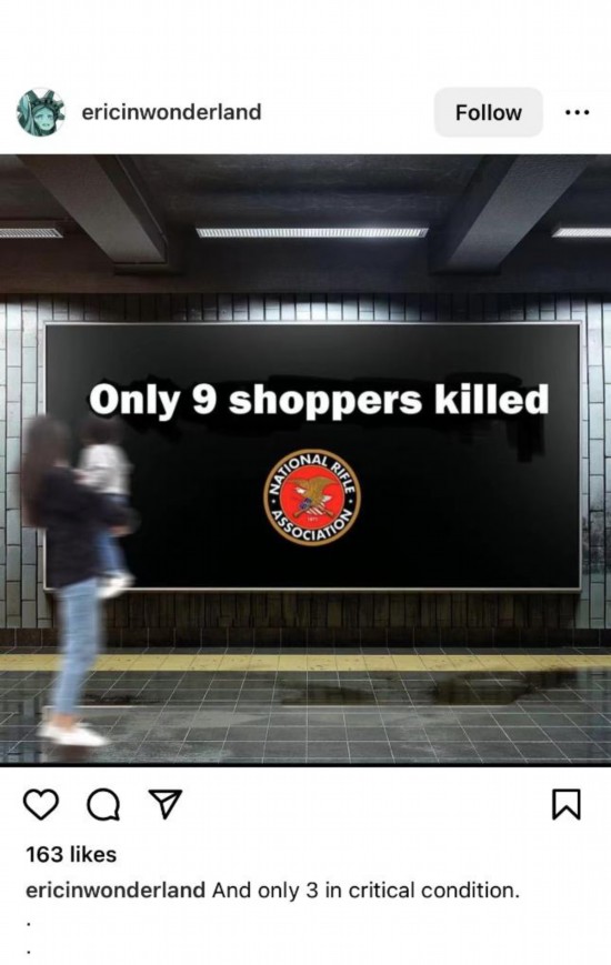 網(wǎng)友Ericinwonderland創(chuàng)作了一則帶有美國步槍協(xié)會標識的“廣告”,上面寫道:“只死了9個?!?/p>
