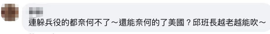 對(duì)于如此糊弄且不堅(jiān)決地表態(tài),民眾留言評(píng)論,“全臺(tái)灣誰不知道美國(guó)想做什么事都是民進(jìn)黨默許的”“連躲兵役的都奈何不了,還能奈何的了美國(guó)?”“先把部隊(duì)的問題解決好吧,只會(huì)叭叭叭”“嘴巴很厲害,實(shí)際跑最快 !”