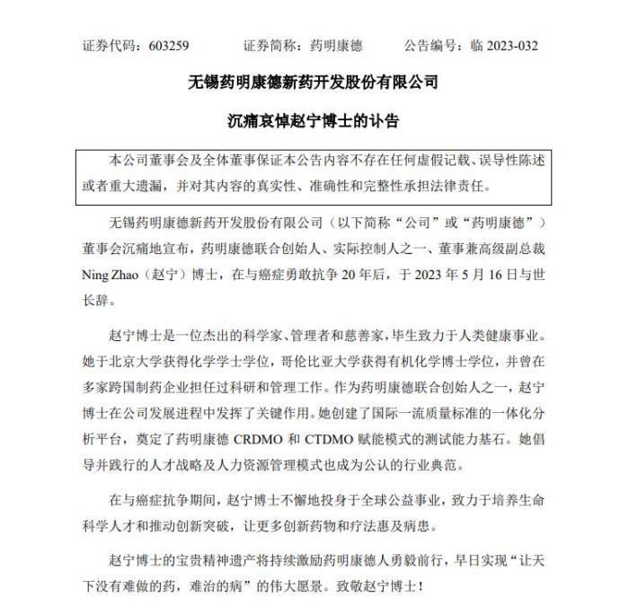 藥明康德發(fā)布的訃告稱,趙寧在與癌癥勇敢抗爭20年后,于2023年5月16日與世長辭。