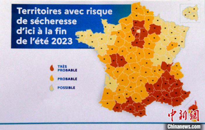 法國官方本周發(fā)表的一份最新報(bào)告顯示,法國今年炎熱干旱和水資源短缺問題可能比去年更加嚴(yán)重。報(bào)告公布的地圖標(biāo)明了今年夏季面臨干旱的省份。法國本土96個省份中有28個省份面臨很高的干旱風(fēng)險(xiǎn),這其中包括地中海沿岸多個省份和巴黎大區(qū)多個省份。 中新社記者 李洋 攝