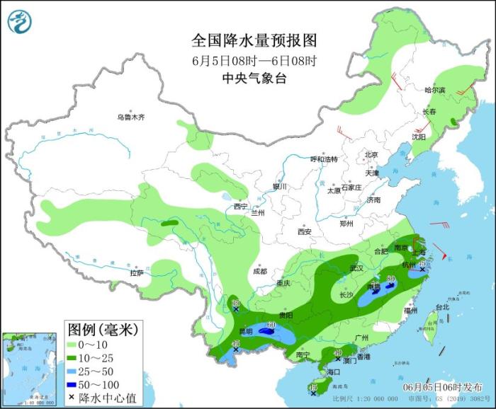 6月5日08時(shí)至6日08時(shí),江淮東部、江漢南部、江南西部和中北部、西南地區(qū)南部、華南西部和南部等地部分地區(qū)有中到大雨,其中,江西中北部、廣西西部、云南東部等地局地有暴雨(50~80毫米)。內(nèi)蒙古中東部、東北地區(qū)、江南東北部等地部分地區(qū)有4~5級風(fēng)(見圖1)。東海北部海域?qū)⒂?~7級風(fēng)、陣風(fēng)8級。
