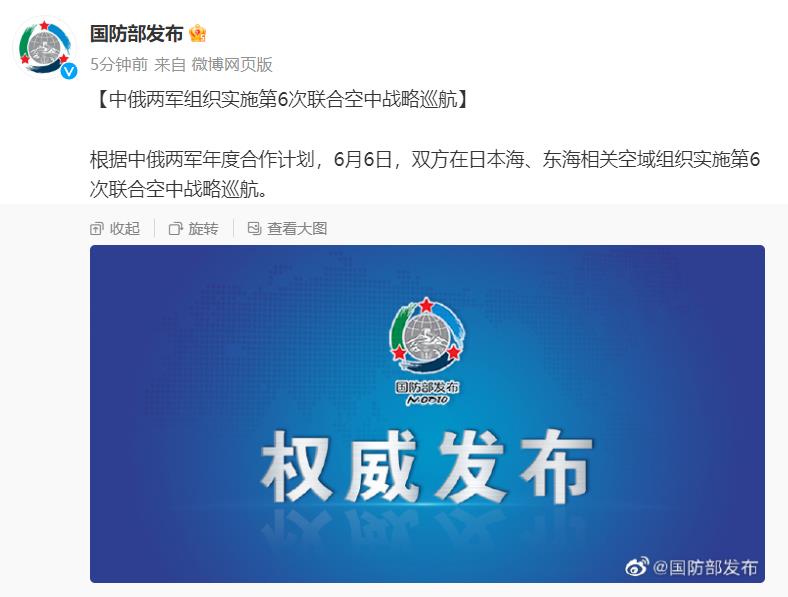 中新網(wǎng)6月6日電 據(jù)國防部新聞局官方微博消息,根據(jù)中俄兩軍年度合作計劃,6月6日,雙方在日本海、東海相關(guān)空域組織實施第6次聯(lián)合空中戰(zhàn)略巡航。