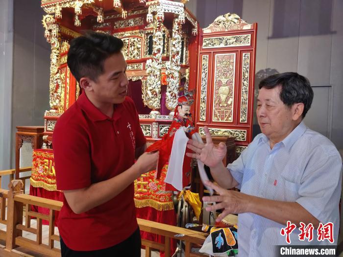 6月17日,在廈門舉行的海峽兩岸布袋木偶戲藝術(shù)節(jié)上,80歲的莊陳華(右一)正在指導(dǎo)吳聲杰(左一)表演布袋木偶戲?!≈行律缬浾?葉秋云 攝