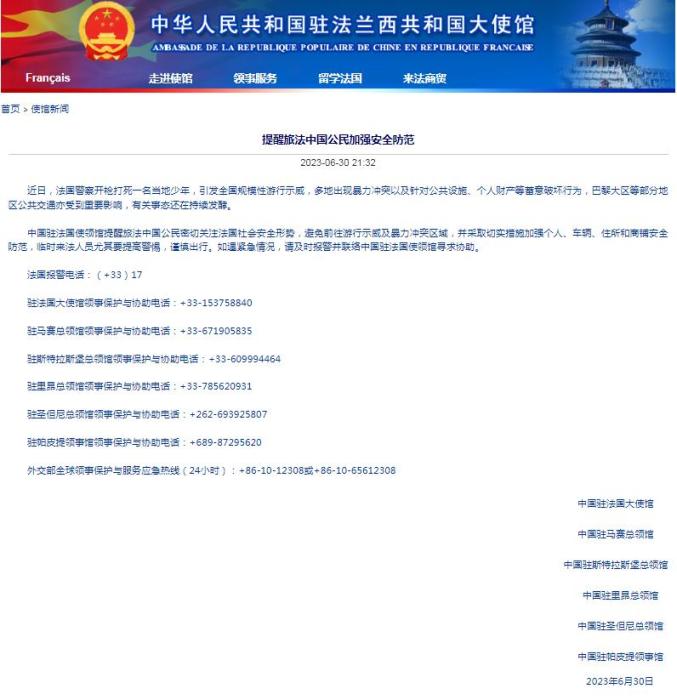 中新網(wǎng)7月1日電 據(jù)中國駐法國大使館當(dāng)?shù)貢r間6月30日消息,法國警察開槍射殺少年事件,在法國引發(fā)全國規(guī)模性游行示威,事態(tài)持續(xù)發(fā)酵,中國駐法國大使館提醒旅法中國公民加強安全防范。