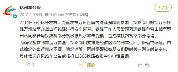 中新網(wǎng)7月4日電 據(jù)成都鐵路局達(dá)州車務(wù)段官方微博消息,7月4日7時(shí)48分左右,受重慶市萬州區(qū)境內(nèi)持續(xù)強(qiáng)降雨影響,鐵路部門封鎖萬涼鐵路萬州站至齊岳山間線路進(jìn)行安全巡查。鐵路工作人員發(fā)現(xiàn)萬涼鐵路魚背山站至羅田站間駟步河鐵路橋部分橋墩被洪水沖擊受損,造成該鐵路橋梁部分垮塌。為確保旅客列車運(yùn)行安全,鐵路部門安排途經(jīng)該區(qū)段的列車迂回、折返或停運(yùn)。