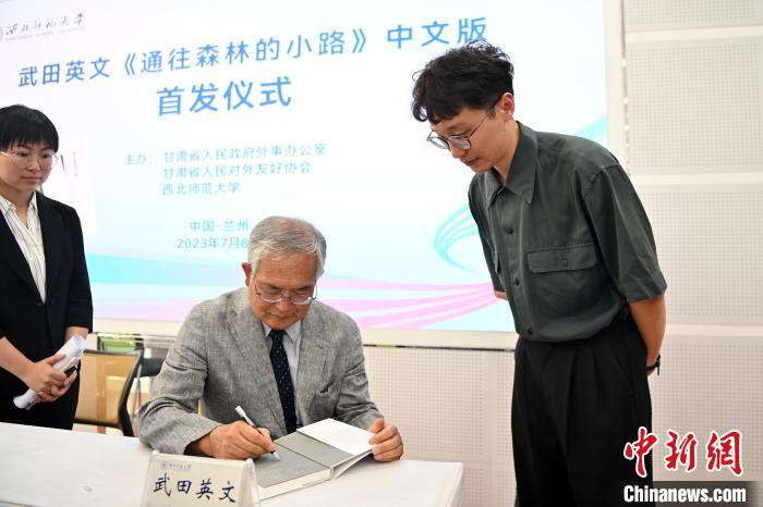 2023年7月8日,武田英文著作《通往森林的小路》中文版首發(fā)儀式在蘭州舉行。圖為武田英文給現(xiàn)場嘉賓簽名?!≈行律缬浾?九美旦增 攝