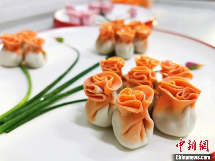資料圖:圖為以胡蘿卜汁和面包成的“花餃子”,顏色艷麗?!¢Z姣 攝