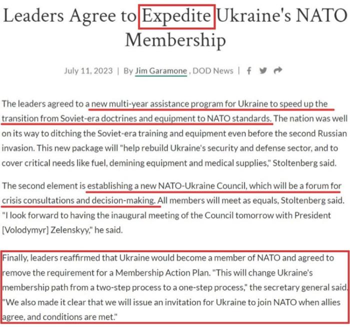 在一片爭吵聲中,北約立陶宛峰會(huì)發(fā)表的公報(bào)確定了一個(gè)包含“三要素”的“加快烏克蘭入約計(jì)劃”: