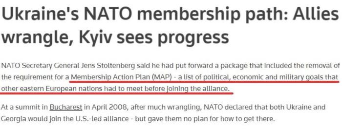 在美國推動(dòng)下,那次北約峰會(huì)接受了烏克蘭加入北約“成員國行動(dòng)計(jì)劃”的申請(qǐng),并首次承諾“最終會(huì)接納烏克蘭為北約成員國”。