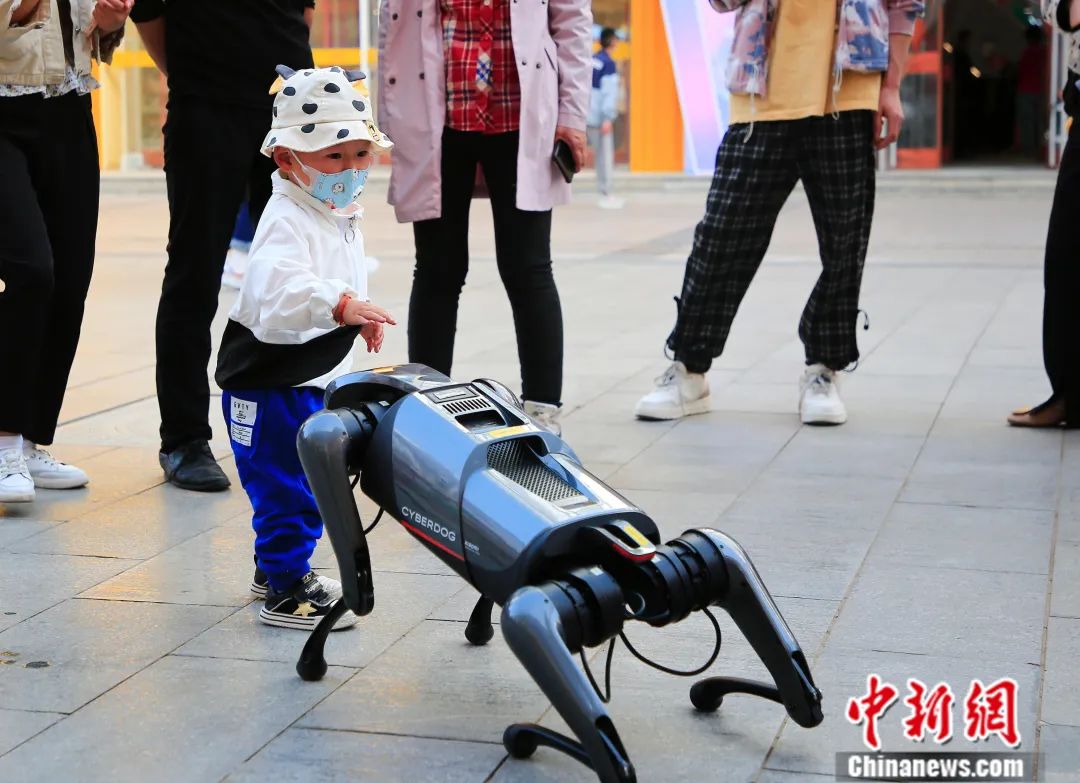 2022年4月9日,在寧夏銀川鼓樓步行街,一名小朋友與機(jī)器人“鐵蛋”互動(dòng)。袁宏彥攝