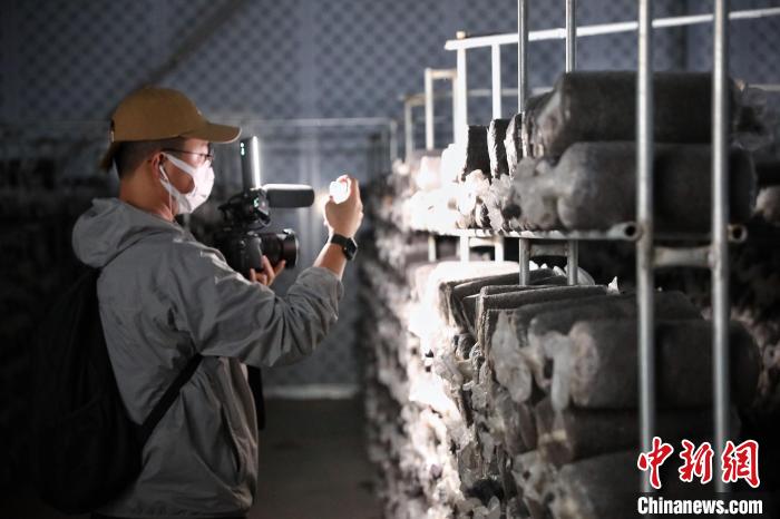 7月17日,甘肅省古浪縣,參加“絲路風(fēng)采 如意甘肅”聯(lián)合采訪活動(dòng)的兩岸及香港記者在當(dāng)?shù)仞B(yǎng)菌出菇的冷庫(kù)內(nèi)采訪拍攝。 中新社記者 李雪峰 攝