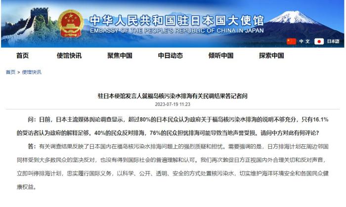中國(guó)駐日本使館發(fā)言人就福島核污染水排海有關(guān)民調(diào)結(jié)果答問