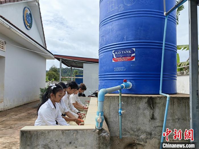 2023年6月,俄勒塞村小學的學生正在使用凈水系統(tǒng)?!≈行律缬浾?楊強攝