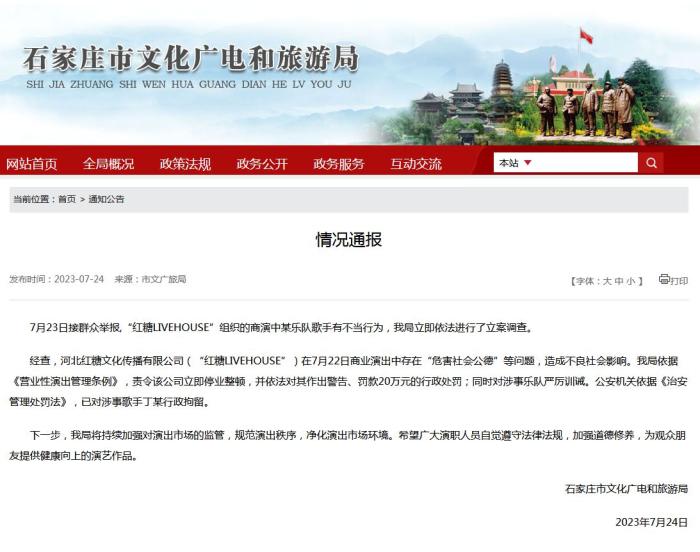 經(jīng)查,河北紅糖文化傳播有限公司(“紅糖LIVEHOUSE”)在7月22日商業(yè)演出中存在“危害社會(huì)公德”等問題,造成不良社會(huì)影響。石家莊市文化廣電和旅游局依據(jù)《營業(yè)性演出管理?xiàng)l例》,責(zé)令該公司立即停業(yè)整頓,并依法對(duì)其作出警告、罰款20萬元的行政處罰;同時(shí)對(duì)涉事樂隊(duì)嚴(yán)厲訓(xùn)誡。公安機(jī)關(guān)依據(jù)《治安管理處罰法》,已對(duì)涉事歌手丁某行政拘留。