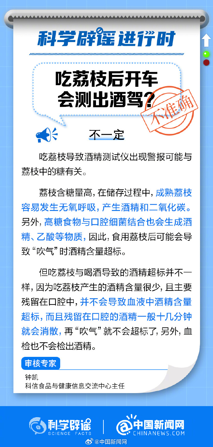 成熟荔枝容易發(fā)生無氧呼吸,產生酒精和二氧化碳。另外,高糖食物與口腔細菌結合也會生成酒精、乙酸等物質。但吃荔枝產生的酒精含量很少,殘留在口腔的酒精一般十幾分鐘就會消散,血檢也不會檢出酒精。(來源:科學辟謠、中國新聞網(wǎng)微博)
