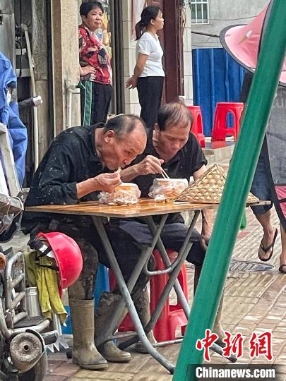村中,七旬的吳大爺和數(shù)名年齡相近的村民,已自發(fā)幫助清理村中街道長(zhǎng)達(dá)11個(gè)小時(shí)。17時(shí)許,吳大爺在街邊攤位吃著面條,稍作歇息后,他將重新投入清理工作。
