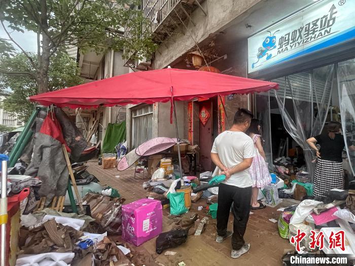 馮先生在蘭田村內(nèi)經(jīng)營(yíng)一家砂鍋米線店,積水退去,店內(nèi)人員正在清理器具,門口堆放著大量損失物品。呂巧琴 攝