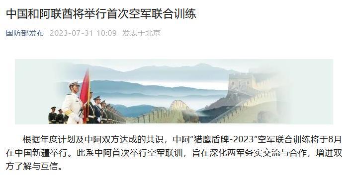 中新網(wǎng)7月31日電 據(jù)“國防部發(fā)布”微信公眾號31日消息,根據(jù)年度計劃及中阿雙方達成的共識,中阿“獵鷹盾牌-2023”空軍聯(lián)合訓練將于8月在中國新疆舉行。此系中阿首次舉行空軍聯(lián)訓,旨在深化兩軍務(wù)實交流與合作,增進雙方了解與互信。