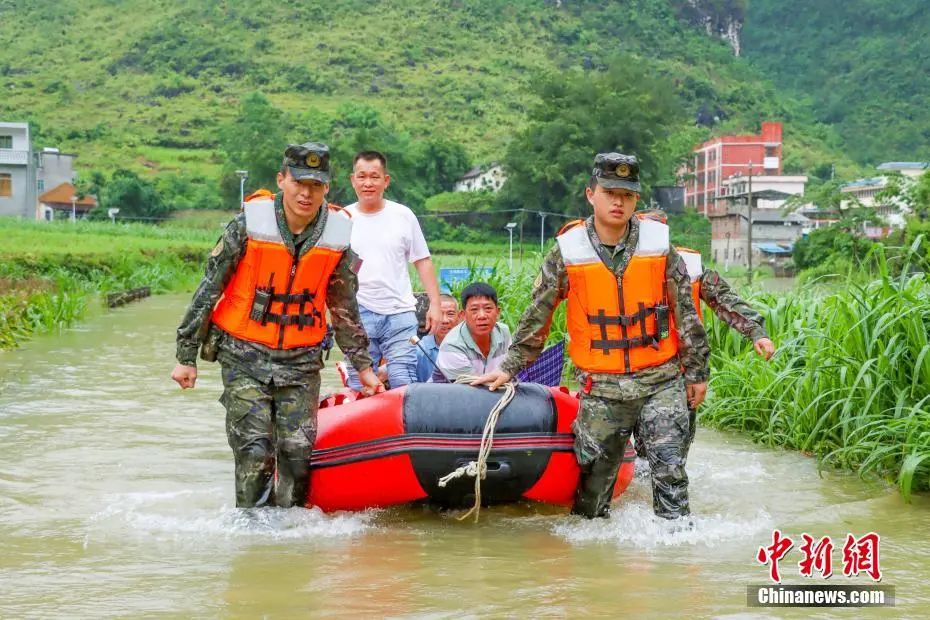 2023年6月24日,廣西河池市都安縣拉烈鎮(zhèn)三表村臨近河床水位上漲河水倒灌、山洪暴發(fā),部分村民被洪水圍困。武警官兵利用橡皮艇轉移受災民眾。