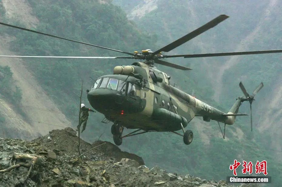 2008年5月20日,成都軍區(qū)陸航團姜廣偉王牌直升機組上午十時以單輪首次成功強降北川重災區(qū)“定時炸彈”——堰塞湖無名塌方小土堆上。中新社記者 賈國榮 攝