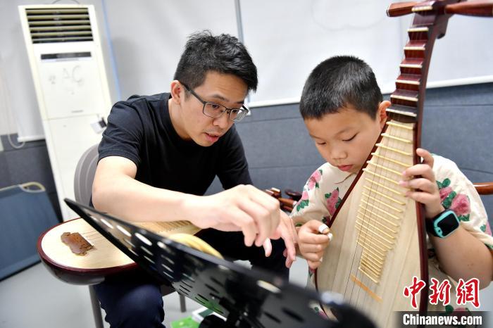 中新網福州8月2日電 (葉秋云)“左手大拇指不要太靠后”“手移動的時候,手臂要跟著移動,彈的時候才不會怪怪的”……從演奏姿勢、轉腕到手指的彈挑,魏辰運手把手指導著一位8歲小男孩彈琵琶。