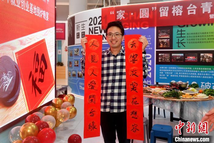 圖為魏辰運參加留榕臺青圍爐守歲話新年活動并展示自己寫的春聯(lián)。呂明 攝