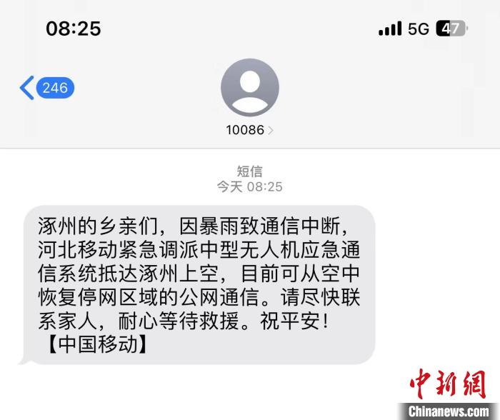 中新網(wǎng)石家莊8月3日電 (郝燁 趙景科)“【中國(guó)移動(dòng)】涿州的鄉(xiāng)親們,因暴雨致通信中斷,河北移動(dòng)緊急調(diào)派中型無(wú)人機(jī)應(yīng)急通信系統(tǒng)抵達(dá)涿州上空,目前可從空中恢復(fù)停網(wǎng)區(qū)域的公網(wǎng)通信。請(qǐng)盡快聯(lián)系家人,耐心等待救援。祝平安!”8月3日早,河北涿州災(zāi)區(qū)的群眾收到一條來(lái)自空中的短信。