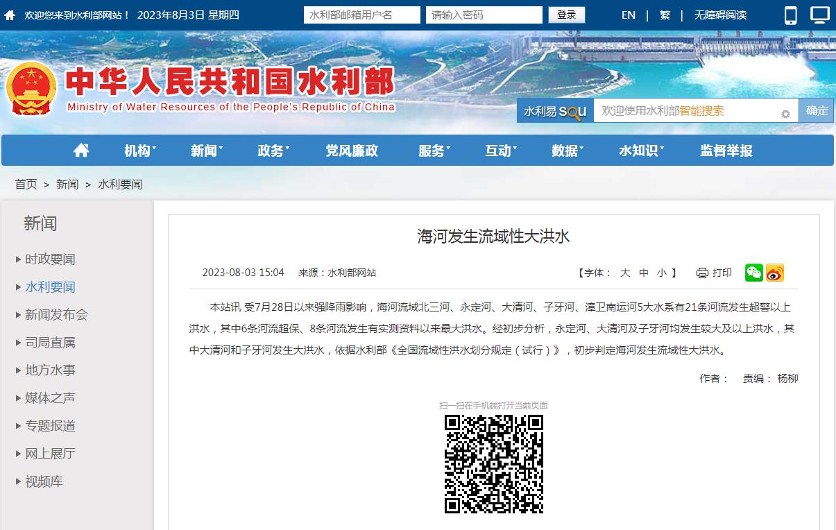 中新網(wǎng)8月3日電 據(jù)水利部網(wǎng)站3日消息,受7月28日以來強(qiáng)降雨影響,海河流域北三河、永定河、大清河、子牙河、漳衛(wèi)南運(yùn)河5大水系有21條河流發(fā)生超警以上洪水,其中6條河流超保、8條河流發(fā)生有實(shí)測(cè)資料以來最大洪水。經(jīng)初步分析,永定河、大清河及子牙河均發(fā)生較大及以上洪水,其中大清河和子牙河發(fā)生大洪水,依據(jù)水利部《全國(guó)流域性洪水劃分規(guī)定(試行)》,初步判定海河發(fā)生流域性大洪水。