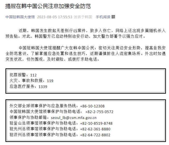 中新網(wǎng)8月5日電 據(jù)中國駐韓國大使館微信公眾號(hào)5日消息,近期,韓國發(fā)生數(shù)起無差別行兇案件,致多人傷亡,網(wǎng)絡(luò)上還出現(xiàn)多篇隨機(jī)殺人預(yù)告貼。對(duì)此,韓國警方已啟動(dòng)特別治安行動(dòng),加大警力部署予以強(qiáng)力應(yīng)對(duì)。