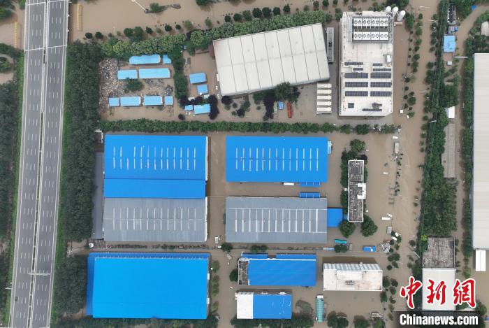 8月5日,中圖網(wǎng)倉儲(chǔ)中心所在區(qū)域依然有大量積水。(無人機(jī)照片)中新社記者 韓冰 攝