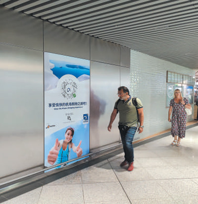 希臘雅典國際機(jī)場內(nèi),旅客走過用中文書寫的廣告海報。