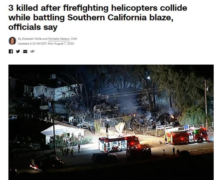 中新網(wǎng)8月7日電 綜合美媒報(bào)道,美國(guó)消防官員表示,當(dāng)?shù)貢r(shí)間8月6日,一架被派往加州撲滅野火的消防直升機(jī)與另一架消防直升機(jī)相撞,造成3人死亡。