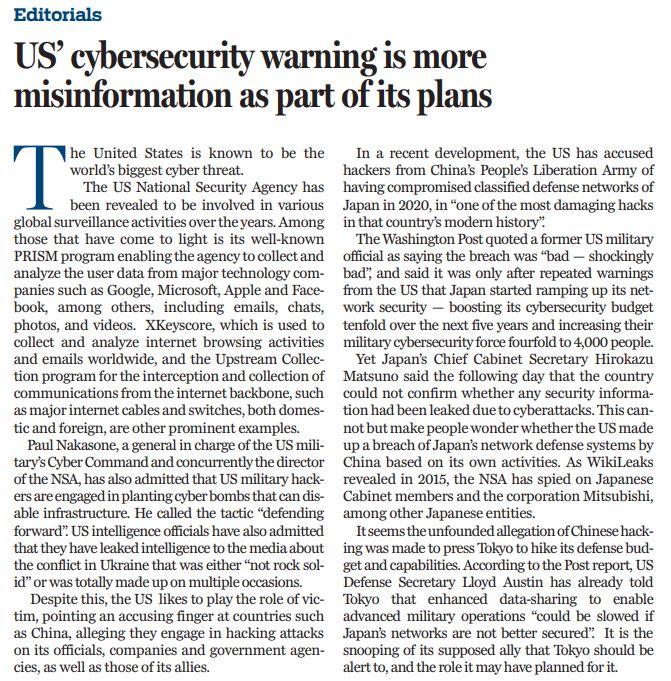 盡管如此,美國(guó)卻總是裝出一副受害者的樣子,指責(zé)中國(guó)等國(guó)對(duì)美國(guó)及其盟友的官員、企業(yè)和政府機(jī)構(gòu)發(fā)動(dòng)黑客攻擊。最近,美國(guó)就指責(zé)中國(guó)黑客在2020年入侵了日本防衛(wèi)部門(mén)的機(jī)密網(wǎng)絡(luò),稱之為“日本現(xiàn)代史上最具破壞性的黑客攻擊之一”。然而,日本內(nèi)閣官房長(zhǎng)官松野博一表示,日本無(wú)法確認(rèn)是否有任何安全信息因網(wǎng)絡(luò)攻擊而泄露。這不禁讓人懷疑,美國(guó)是否根據(jù)自己的黑客活動(dòng),編造了中國(guó)破壞日本網(wǎng)絡(luò)防御系統(tǒng)的故事?維基解密在2015年就披露,美國(guó)國(guó)家安全局在秘密監(jiān)視日本內(nèi)閣成員和三菱公司,以及其他日本實(shí)體。