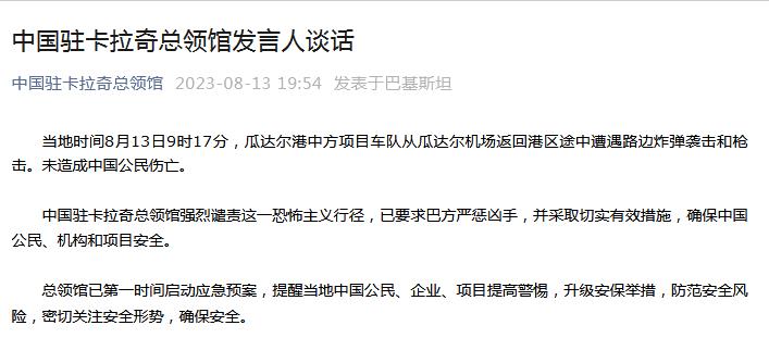 中國駐卡拉奇總領(lǐng)館強(qiáng)烈譴責(zé)這一恐怖主義行徑,已要求巴方嚴(yán)懲兇手,并采取切實(shí)有效措施,確保中國公民、機(jī)構(gòu)和項(xiàng)目安全。