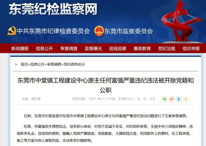 中新網(wǎng)北京8月14日電 近日,廣東東莞市紀(jì)委監(jiān)委發(fā)布消息,東莞市中堂鎮(zhèn)工程建設(shè)中心原主任何富強(qiáng)被“雙開”。