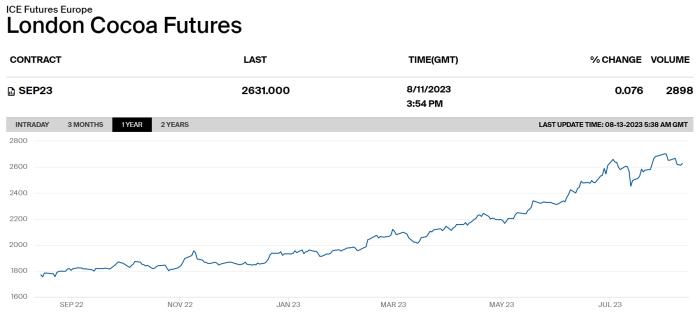 不僅僅是可可,制作巧克力所需的另一種主要成分食糖,今年以來,期貨價(jià)格也持續(xù)處于高位。