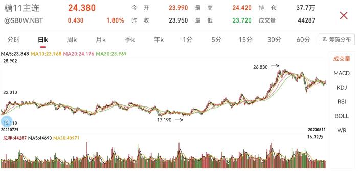 雖然近段時(shí)間食糖價(jià)格有所下降,但截至8月11日,糖11主連期貨價(jià)格仍收至每磅24.38美分。