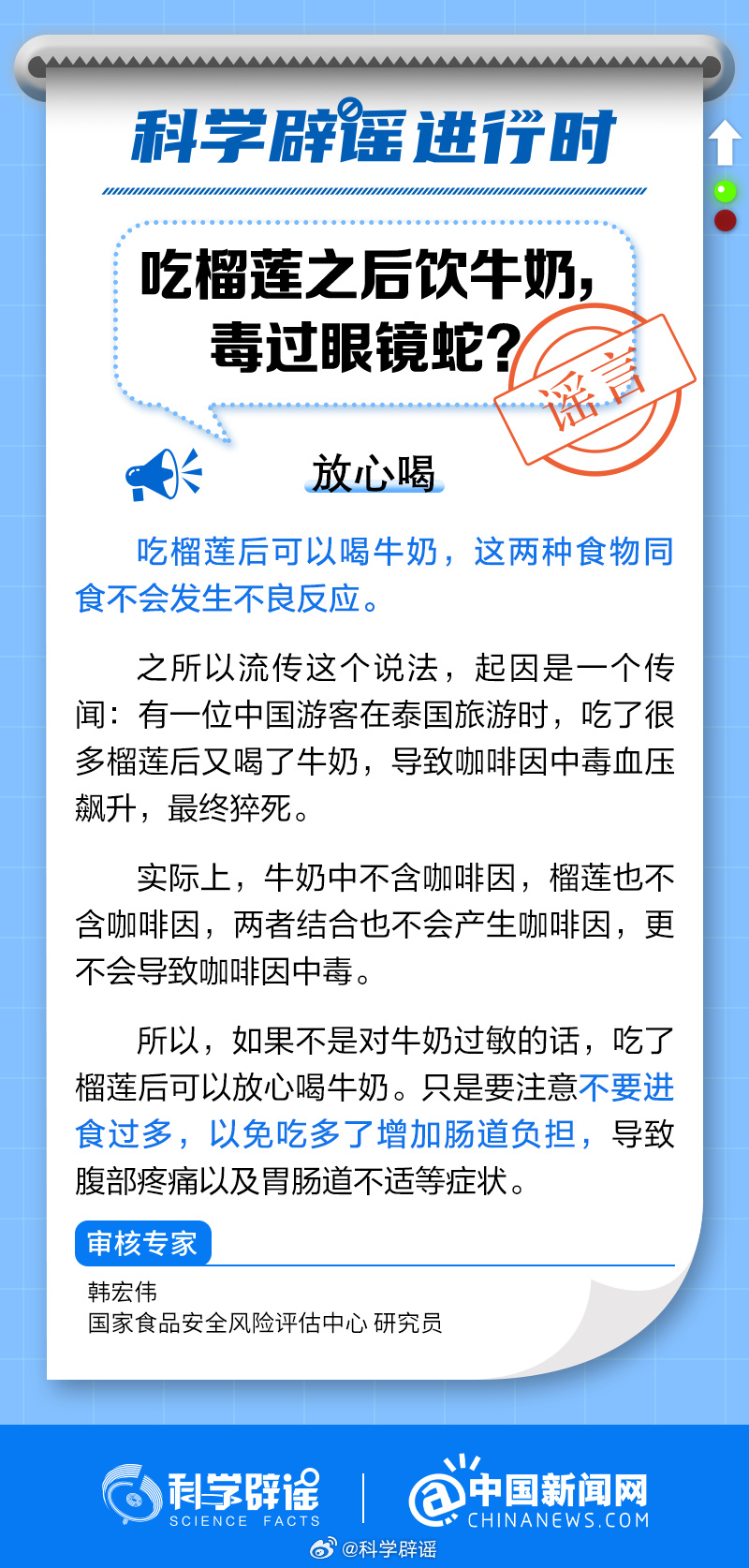 中新網(wǎng)8月24日電 吃榴蓮后可以喝牛奶,這兩種食物同食不會發(fā)生不良反應(yīng)。之所以流傳這個說法,起因是一個傳聞:有一位中國游客在泰國旅游時,吃了很多榴蓮后又喝了牛奶,導(dǎo)致咖啡因中毒血壓飆升,最終猝死。實際上,牛奶中不含咖啡因,榴蓮也不含咖啡因,兩者結(jié)合也不會產(chǎn)生咖啡因,更不會導(dǎo)致咖啡因中毒。(來源:@科學(xué)辟謠 @中國新聞網(wǎng) )