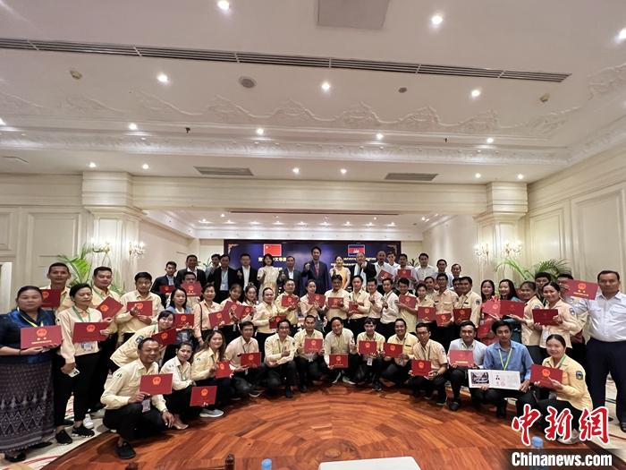 8月21日至30日,柬埔寨中文導(dǎo)游海外培訓(xùn)班在暹粒舉行,來自金邊和暹粒兩地的60名中文導(dǎo)游及旅游從業(yè)者參加培訓(xùn)學(xué)習(xí)。圖為8月30日,柬埔寨中文導(dǎo)游海外培訓(xùn)班結(jié)業(yè)典禮。 中新社發(fā) 項(xiàng)目團(tuán)隊(duì)供圖