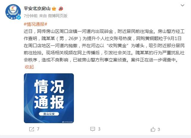 中新網(wǎng)9月3日電 3日,北京市公安局房山分局官方微博發(fā)布情況通報稱,近日,網(wǎng)傳房山區(qū)周口店鎮(zhèn)一河道內出現(xiàn)碎金,附近居民前往淘金。房山警方經(jīng)工作查明,隗某某(男,26歲)為提升個人社交賬號熱度,網(wǎng)購黃銅顆粒于9月1日在周口店地區(qū)一河道內拋撒,并在河邊以“收購黃金”為噱頭,吸引附近部分居民前往撿拾?,F(xiàn)場相關視頻在網(wǎng)上傳播后,引發(fā)社會關注。隗某某的行為嚴重擾亂社會秩序,造成不良影響,已被房山警方刑事立案偵查。案件正在進一步調查中。