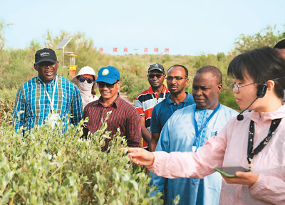 近日,來(lái)自非洲的專(zhuān)家在中國(guó)新疆參加中非治沙培訓(xùn)班。圖為在塔克拉瑪干沙漠腹地塔中植物園,中方技術(shù)人員向非洲學(xué)員介紹荒漠植物。